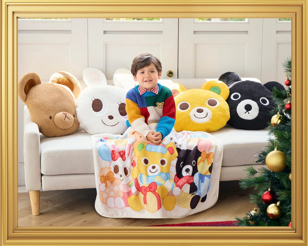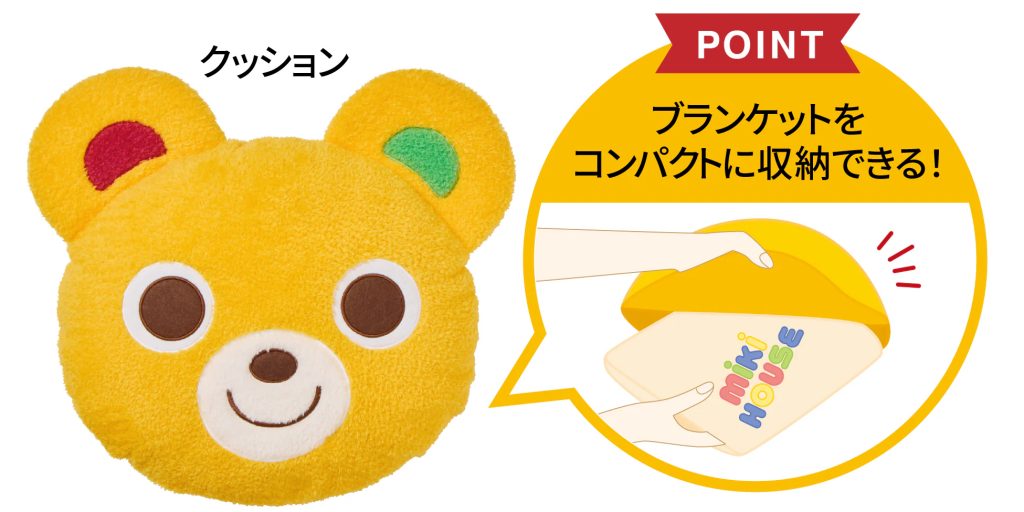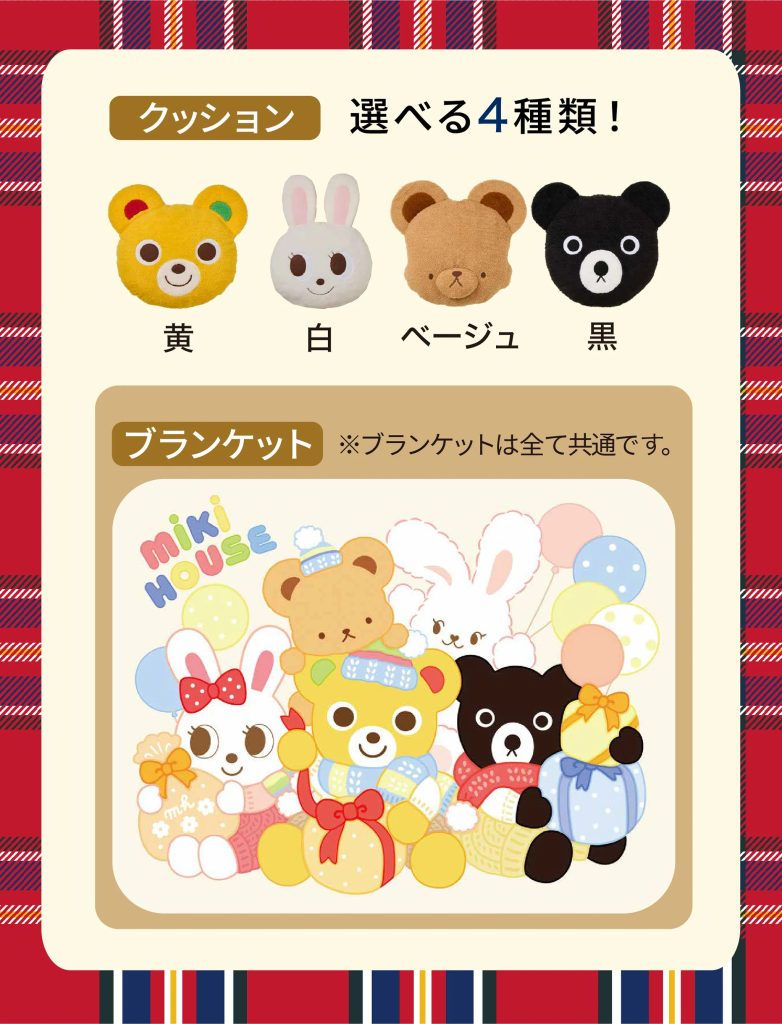 55,000円(税込)以上お買いあげいただいたお客さまに、ブランケットをコンパクトに収納できる「ブランケット付きクッション」をおひとつさしあげます。クッションの種類は全部で4種類です。お好きなキャラクター(クマのプッチー・うさぎのうさこ・ミキハウスベア・黒クマのBくん)をおひとつお選びください。